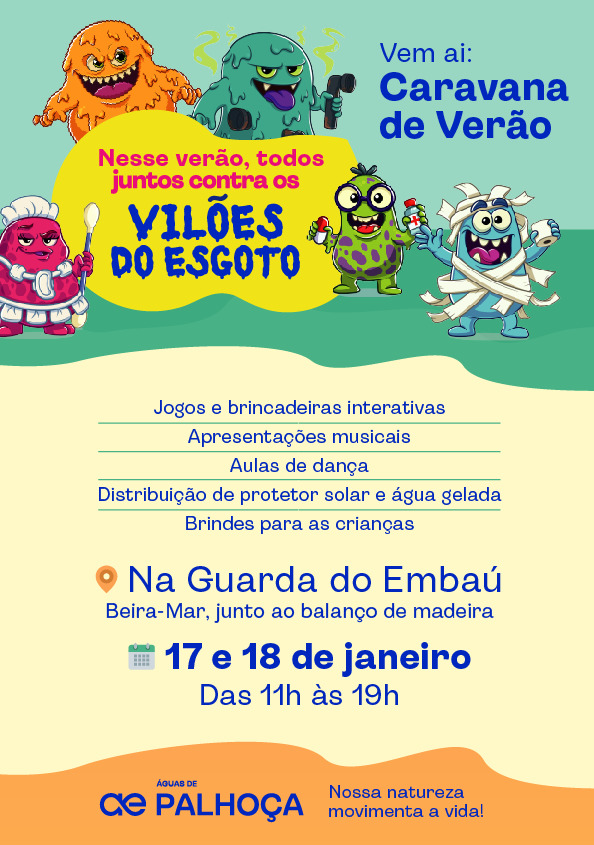 A Guarda do Embaú, uma das praias mais queridas de Palhoça, será novamente palco de uma programação especial que une lazer, informação e cuidado com o meio ambiente. Nos dias 17 e 18 de janeiro, a Caravana de Verão da Águas de Palhoça volta à praia com uma série de ações educativas, neste ano com o tema “Juntos Contra os Vilões do Esgoto”, convidando moradores e turistas a se tornarem verdadeiros heróis da preservação da água.